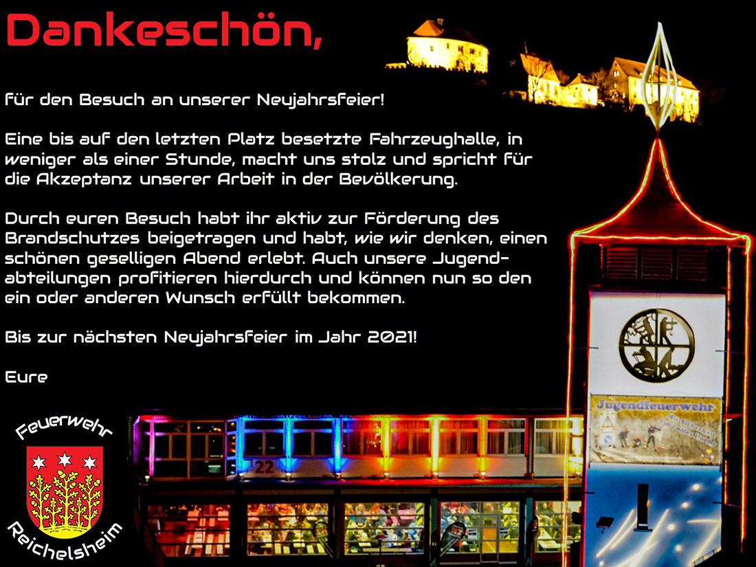 Neujahrsfeier der Freiwilligen Feuerwehr Reichelsheim Eine großartige Neujahrsfeier liegt in diesem Jahr hinter uns. › ‹ 1 2 3 4 5 6